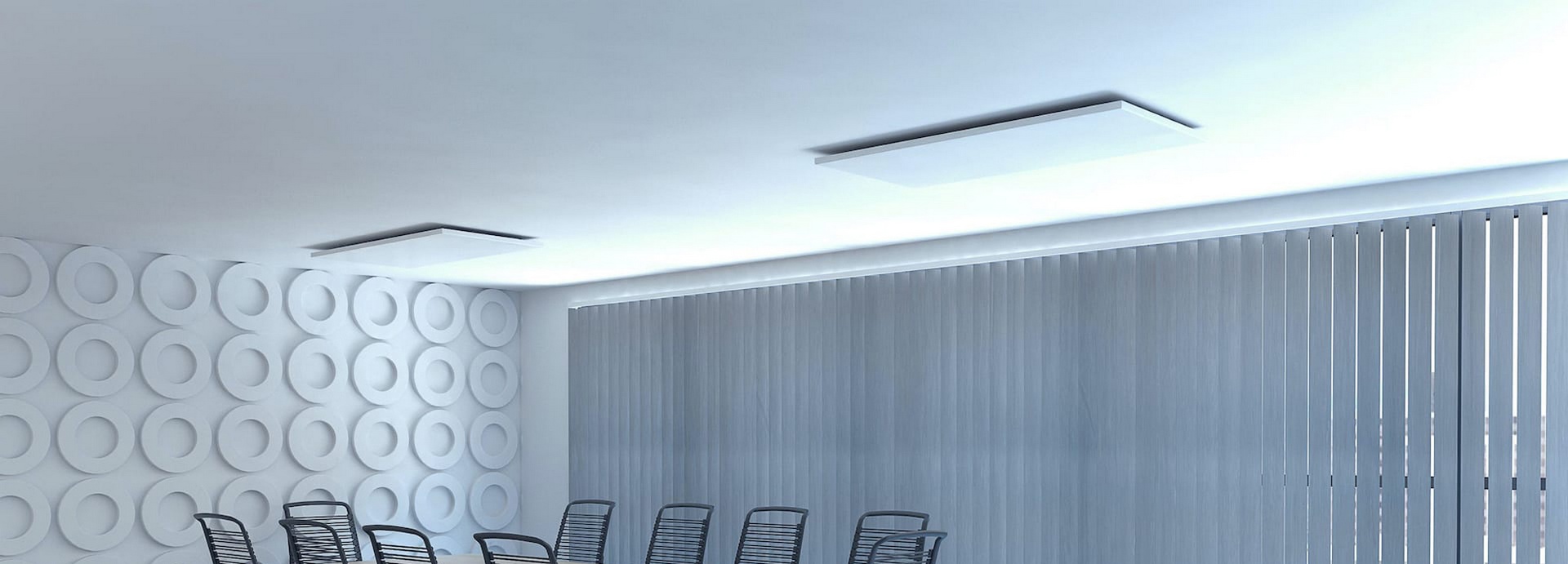 The ceiling heating system, equipped with infrared (IR) panels, is both stylish and subtly integrated, making it not immediately obvious to the observer.